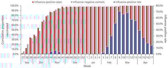 Cumulative proportion of vaccination for influenza-positive cases and influenza-negative controls, and percent positive of influenza by calendar time in Beijing, China, for week 37 of 2022 to week 17 of 2023.