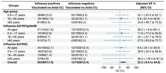 - Guo, J.; Chen, X.; Guo, Y.; Liu, M.; Li, P.; Tao, Y.; Liu, Z.; Yang, Z.; Zhan, S.; Sun, F. Real-world effectiveness of seasonal influenza vaccination and age as effect modifier: A systematic review, meta-analysis and meta-regression of test-negative design studies. Vaccine 2024, 42, 1883–1891. [Google Scholar] [CrossRef]