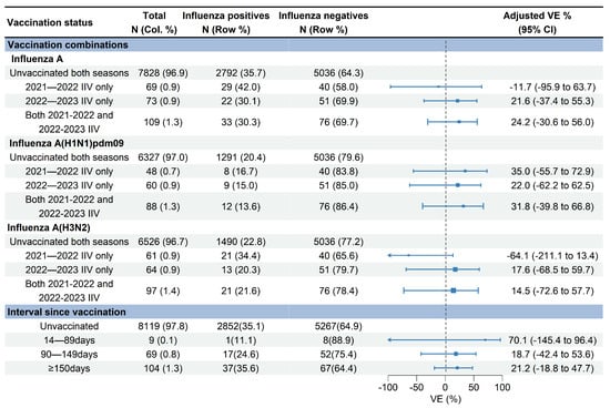 VE against influenza A (H1N1)pdm09 for receipt of the 2021–2022 vaccination only, 2022–2023 vaccination only, and vaccinations in both seasons were 35.0% (95% CI: −55.7% to 72.9%), 22.0% (95% CI: −62.2% to 62.5%), and 31.8% (95% CI: −39.8% to 66.8%), respectively (Figure 5). VE against influenza A (H3N2) for receipt of the 2022–2023 vaccination only and vaccinations in both 2021–2022 and 2022–2023 seasons were 17.6% (95% CI: −68.5% to 59.7%) and 14.5% (95% CI: −72.6% to 57.7%), respectively. No significant effectiveness against influenza A (H3N2) was observed for receipt of the 2021–2022 vaccination only (−64.1%, 95% CI: −211.1% to 13.4%) (Figure 5).