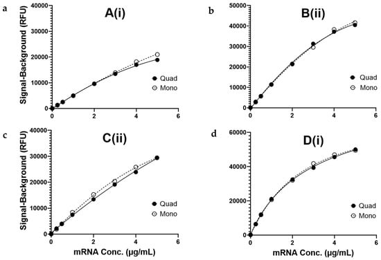 (a–d) Response curves for monovalent (mono) and quadrivalent (quad) mRNA constructs encapsulated in LNPs on the capture oligos shown: (a–c) were fit to a quadratic regression (R2 ≥ 0.99) for quantification, and (d) was fit to a 4-parameter logistic regression (4PL) (R2 ≥ 0.99).