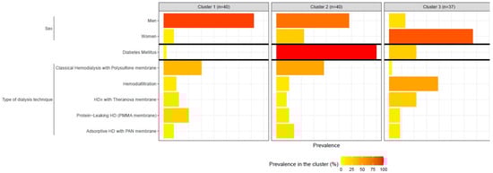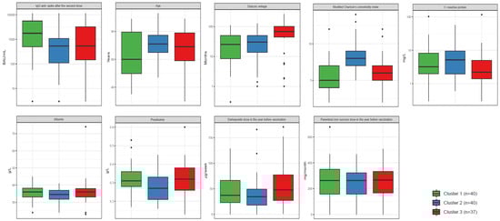 The patients were divided into three clusters based on the proposed variables. Cluster 1 and 2 each had 40 patients, while Cluster 3 had 37 patients. The main characteristics of these three clusters are shown in Table 2 and Figure 1 and Figure 2. Cluster 1 was mainly composed of relatively young men (90%) without diabetes, with a moderate dialysis vintage, a low modified Charlson’s comorbidity index, and a strong serological response to vaccination. In contrast, Cluster 3 was composed of older women (84%), mainly non-diabetic, with a long dialysis vintage, a low modified Charlson’s comorbidity index, and a poor vaccine response. Lastly, Cluster 2 was characterized by a poor vaccine response in a group of mainly male diabetic patients with a high modified Charlson’s comorbidity index, higher CRP, and moderate dialysis vintage (Table 2 and Figure 1 and Figure 2).