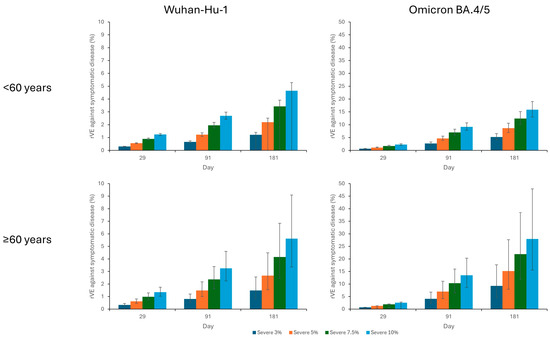 The rVE against severe disease caused by Wuhan-Hu-1 was low in both age groups, ranging from 0.3% (0.3–0.3) and 0.3% (0.3–0.5) on day 29 to 1.2% (0.0–1.4) and 1.5% (0.8–2.6) for participants <60 years and ≥60 years, respectively. The rVE against Omicron BA.4/5 was higher, with estimates ranging from 0.6% (0.5–0.7) and 0.7% (0.2–0.8) on day 29 to 5.2% (4.2–6.5) and 9.3% (4.6–17.7) by day 181 for participants <60 years and ≥60 years, respectively (Figure 2).