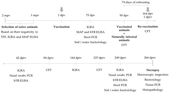Timeline of the trial. A schematic timeline illustrating the most relevant intervention and sampling points, types of samples and techniques used to monitor the animals prior to the necropsy. mpv: months pre-vaccination. dpv: days post-vaccination. dprv: days post re-vaccination. TST: tuberculin skin test, IGRA: Interferon-Gamma release assay, MAP: Mycobacterium avium subsp. Paratuberculosis, ELISA: Enzyme-Linked Immunosorbent assay, CFT: caudal fold test, PCR: Polymerase Chain Reaction, bTB: bovine tuberculosis.