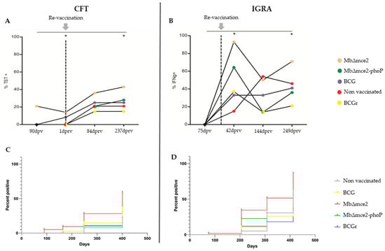 (A). Prevalence of animals positive to the caudal fold test (CFT) in each group at the different sampling times. (B). Percentage of positive animals to the interferon-gamma release assay (IGRA). Kruskal–Wallis test and Dunn’s post test. * Prevalence that differed significantly between the studied groups, p < 0.05. The dotted vertical line and gray arrow indicate the day of the re-vaccination. (C,D). Incidence of positivity for both CFT and IGRA, respectively, represented by the Kaplan–Meier analysis. TST: Tuberculin skin test. Dpv: days post vaccination. Dprv: days post re-vaccination. IFNg: Interferon gamma.