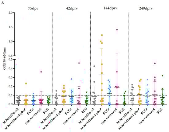 This test was performed to evaluate the humoral immune response by detecting antibodies against M. bovis and MAP, which is also endemic in Argentina, and a possible cause of false-positive animals. For MAP detection, an indirect ELISA was performed using the commercial antigen PPDA (Allied Monitor Inc., Fayette, MO, USA). Plasma from the animals was collected at two months’ pre-vaccination (mpv) from naïve animals and at 75 dpv. Animals whose OD 405 nm exceeded 50% of the value compared to the positive control were considered positive. The procedures and details of the technique have been previously described by Moyano et al. [21]. The presence of anti-M. bovis antibodies were assessed with an indirect ELISA test using the PPDB antigen (Bovine tuberculin PPD 3000, Prionics, Lelystad, The Netherlands). Plasma from the animals was collected at 75 dpv, 42 and 249 dprv. The procedures and details of the technique have been previously described by Garbaccio et al. [22].