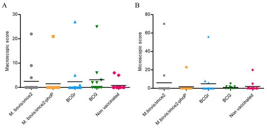 Regarding the macroscopic lesions, 20.9% (14/67) of the animals exhibited LCT. The M. bovis BCG (41.7%; 15.2–72.3) and M. bovis BCGr (21%; 4.7–50.8) groups had the highest proportion of LCT, followed by the groups vaccinated with the M. bovis Δmce2 (21%; 4.7–50.8) and M. bovis Δmce2-phoP (7.1%; 0.2–33.9) strains. Finally, the non-vaccinated group, had the lowest number of animals with LCT (15.3%; 1.9–45.5). The degree of LCT progression revealed that the groups vaccinated with M. bovis BCG and M. bovis BCGr had the highest score of LCT, followed by the groups vaccinated with M. bovis Δmce2 and M. bovis Δmce2-phoP. The non-vaccinated group had the lowest score. Despite these variations, the differences of LCT proportions and disease progression among groups were not significant (p > 0.05) (Figure 4A).
