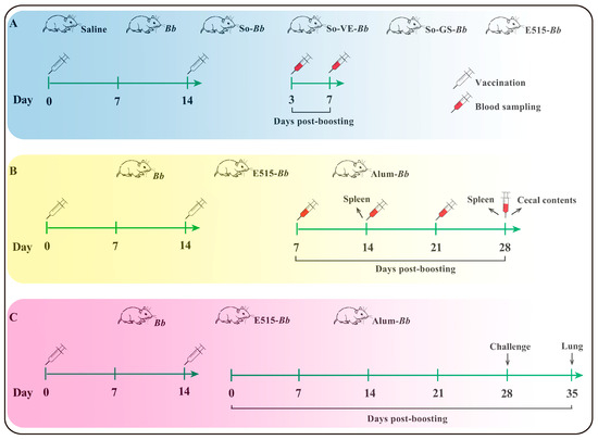 Experiment 1: ICR mice were randomly allocated into six groups (n = 6 per group) and were intramuscularly (i.m.) inoculated twice with 0.2 mL of saline, a Bb antigen and SO-Bb, SO-GS-Bb, SO-VE-Bb or E515-Bb at a 2-week interval, respectively. Serum samples were collected 3 and 7 days after boosting to test for Bb-specific IgG (Figure 1A, Table 1);