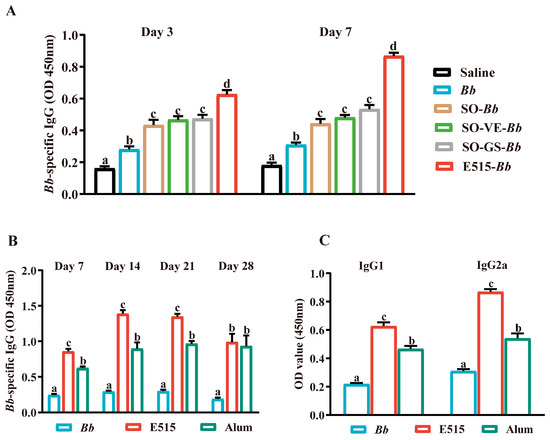 First, we investigated the E515 adjuvant effect and the synergistic effects of VE and GS in SO on the Bb-specific antibody response in mice. Analysis showed that, 3 and 7 days after second immunization, compared to the Bb antigen group, the SO-Bb, SO-VE or SO-GS group induced higher levels of Bb-specific IgG antibody in mice (p < 0.05). The highest level of Bb-specific IgG was detected in the E515-Bb group (p < 0.05) (Figure 2A). As indicated, 7, 14, 21 and 28 days after boosting, both E515 and alum augmented the IgG response elicited by the Bb vaccine. A significant increase in the IgG antibody in the first three weeks post-boost was observed in the E515 (E515-Bb) immunized group (p < 0.05). However, from 28 days after the second injection, there was no difference between the two adjuvanted Bb vaccine groups (Figure 2B). A surge in IgG isotype (IgG1 and IgG2a) responses were also observed in the E515 group 14 days after the booster; this was significantly higher than the Bb antigen and alum (alum-Bb) groups (p < 0.05) (Figure 2C). These results suggest that E515-Bb is a more effective Bb vaccine candidate for inducing a Bb-specific humoral reaction.