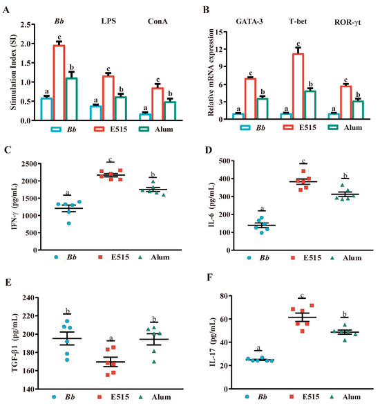 Vaccine-induced cellular immune response (Mice, n = 6/group). Splenocytes were isolated from spleens 14 days after the boost. (A) SI splenocytes were stimulated by Con A (10 µg/mL), LPS (10 µg/mL) or Bb antigen (20 µg/mL) for 48 h. (B) The expression of GATA-3, T-bet and ROR-γt mRNA splenocytes were stimulated by the Bb antigen (20 µg/mL) for 24 h. (C–F) The concentration of the IFN-γ, IL-6, TGF-β1 and IL-17 splenocytes were stimulated by the Bb antigen (20 µg/mL) for 72 h. Data shown as mean ± SE. Bars with different letters are statistically different (p < 0.05).