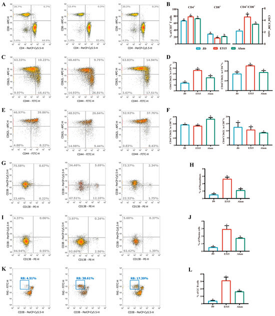 CD4 and CD8 T cells are two crucial subtypes of T lymphocytes. The higher ratio of CD4+/CD8+ often serves as an indicator of a more robust immune response [34]. In our research, the E515 (E515-Bb) group showed a significantly increased percentage of CD4+ T cells and a ratio of CD4+/CD8+ in splenocytes when compared to the alum (alum-Bb) and Bb antigen groups (Figure 5A). Similar results were obtained when Ginsenoside Rg1 was used as an adjuvant for the porcine reproductive and respiratory syndrome virus (PRRSV) vaccine [35]. Effector and memory CD4+ T cells offer superior B cell assistance, facilitating accelerated B cell proliferation, swift class switching, enhanced antibody production and provide critical contributions to protection against microbial pathogens [36]. Our results indicated that E515 promoted a higher percentage of CD4+ TM and TE cells, while alum induced a high number of CD8+ TM and TE cells (Figure 5B,C). This suggested that E515 and alum exhibit different behaviors in terms of their adjuvant effects on the T cell-mediated immune response to the Bb antigen. Next, we investigated B cell differentiation by flow cytometry. Plasmablasts, are the rapidly generated and ephemeral effector cells in the early antibody response, while plasma cells act as the long-lasting mediators of enduring humoral immunity [37]. Germinal center (GC) affinity-matured B cells are responsible for infection and immunization [38]. As illustrated in Figure 5D–F, there was a notable increase in the numbers of plasmablasts, plasma cells and GC B cells in the E515 group than in the other two groups. This finding further validates the results of the higher level of Bb-specific antibody elicited by the E515-Bb vaccine.