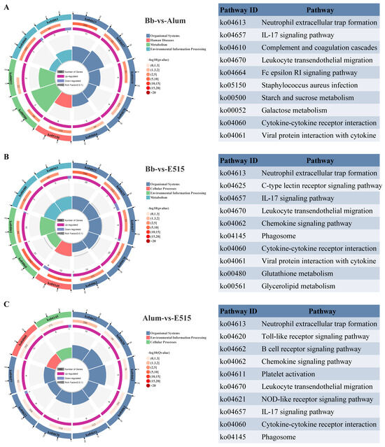 KEGG pathways analysis (n = 3 /group). Comparison of DEGs KEGG modules between Bb-vs-alum (A), Bb-vs-E515 (B) and alum-vs-E515 (C).