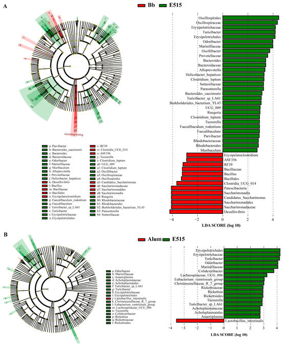 Differences in microbial abundances were identified by linear discriminant analysis (LDA, LDA score > 2) and linear discriminant analysis effect size (LEfSe) analyses. (A) Bb-vs-E515. (B) alum-vs-E515.