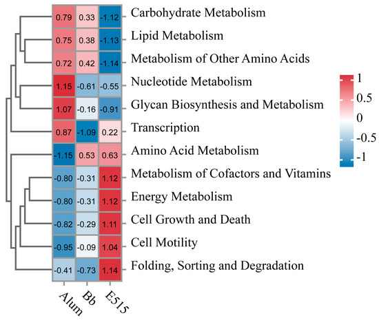 To further understand the microbial dissimilarities between the groups, we evaluated the taxonomic composition of the cecal microbiota. At the level of the phylum, Firmicutes, Bacteroidetes, Desulfobacterota and Campilobacterota, were the main phyla. The mice in the E515 group showed a reduction in Firmicutes (54% in the Bb group, 56% in the alum group, 46% in the E515 group) and an increase in Bacteroidetes (29% in the Bb group, 29% in the alum group, 38% in the E515 group) and Campilobacterota (2% in the Bb group, 2% in the alum group, 4% in the E515 group) (Figure 7J) (Figure S3A). A detailed investigation of the family of Firmicutes revealed reductions in Lactobacillaceae and increases in Oscillospiraceae and Lachnospiraceae. The abundance of Bacteroidetes was represented by increases in Muribaculaceae, Rikenellaceae and Marinifilaceae in the mice after treatment with the E515-Bb vaccine (Figure 7K) (Figure S3B). At the genus level, E515 significantly reduced the abundance of Lactobacillus, Desulfovibrio and the Lachnospiraceae_NK4A136_group and promoted the abundance of Alistipes, Odoribacter and Colidextribacter (Figure 7L) (Figure S3C). LEfSe analyses were conducted (LDA score > 2) to further evaluate the differences in the bacterial composition within the different groups. Figure 8A showed that the relative abundance of 29 bacteria, including Oscillospirales, Odoribacter and Turicibacter, was significantly upregulated in the E515 group, while that of 13 bacteria, including Desulfovibrio, Saccharimonadaceae and Candidatus_Saccharimonas, was downregulated when compared to the Bb group (p < 0.05). The relative abundance of 17 bacteria, including Turicibacter, Erysipelotrichaceae and Odoribacter, was significantly upregulated, while the abundance of Lactobacillus_intestinalis was significantly downregulated in the E515 group when compared to the alum group (p < 0.05) (Figure 8B). These results were consistent with those arising from the Cladogram analysis. In the KEGG profiles, pathways such as “Metabolism of Cofactors and Vitamins”, “Energy Metabolism”, “Cell Growth and Death”, “Cell Motility”, “Translation” and “Folding, Sorting and Degradation” were the most abundant in the E515 group. Some pathways, such as “Nucleotide Metabolism” and “Glycan Biosynthesis and Metabolism” were enriched in the alum group (Figure 9).