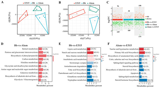 To investigate the metabolic changes in the mice treated with the two adjuvanted Bb vaccines or the Bb antigen, we performed an untargeted metabolomics analysis of the cecal content. A total of 4333 metabolites (1948 negative and 2385 positive mode) compounds were identified in the cecal metabolome. A partial least squares discriminant analysis (PLS-DA) was carried out to separate the different groups; the analysis showed that the samples from the Bb, E515 and alum groups were distinctly classified into three clusters, with significant differences between each group (Figure 10A,B). Next, we screened differential expressed metabolites (DEMs) with a VIP > 1 and p < 0.05. Compared to the Bb antigen group, 345 DEMs (96 up, 249 down) or 223 DEMs (38 up, 185 down) were significantly changed after the Bb antigen was combined with E515 or alum adjuvant. Furthermore, 150 DEMs were upregulated and 175 DEMs were downregulated in the alum-vs-E515 comparison (Figure 10C). The top 10 enriched pathways were listed for every two-group comparison. In the Bb-vs-E515 comparison, five out of the 10 pathways, including “Lipoic acid metabolism” (p = 0.006), “Starch and sucrose metabolism” (p = 0.008), “Beta-Alanine metabolism” (p = 0.015), “Arachidonic acid metabolism” (p = 0.021) and “Serotonergic synapse” (p = 0.033) were significantly activated. In the Bb-vs-alum comparison, four out of the 10 pathways were significantly enriched, including “Retinol metabolism” (p = 0.007), “Pentose and glucuronate interconversions” (p = 0.013), “Biosynthesis of phenylpropanoids” (p = 0.021) and “Carbon metabolism” (p = 0.051). In the alum-vs-E515 comparison, three out of the 10 pathways were significantly activated: “Taurine and hypotaurine metabolism” (p = 0.007), “Primary bile acid biosynthesis” (p = 0.009) and “Biosynthesis of unsaturated fatty acids” (p = 0.020) (Figure 10D–F).
