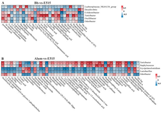 Pearson’s correlation analysis among metabolites and microbes. (A) Bb-vs-E515. (B) Alum-vs-E515. Positive correlation marked with red color, negative correlation marked with green color, * p < 0.05, ** p < 0.01, *** p < 0.001.