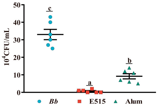Protective effect of E515-Bb vaccine on mice post-Bb challenge. Mice (n = 9/group) were s.c. injected with 0.2 mL of inactivated Bb antigen (3 × 109 CFU/mL) or Bb antigen adjuvanted with E515 or alum. Then, mice were challenged by an intraperitoneal injection of live Bb (5.2 × 109 CFU/mice). Seven days after attack, bacterial loads in lungs were quantified (n = 6). Data are presented as mean ± SE. Bars with different letters are statistically different (p < 0.05).