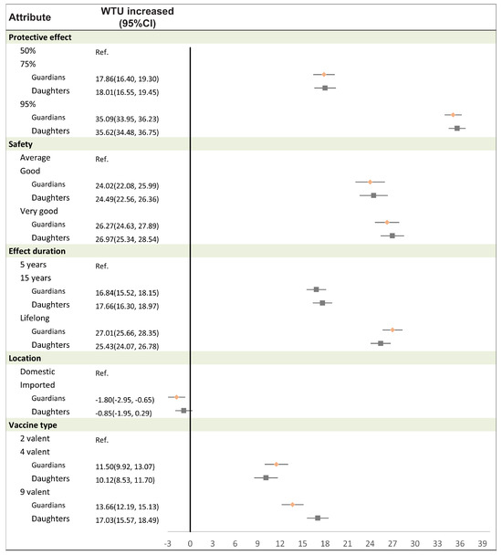 Comparing the willingness to uptake (WTU) between mothers and daughters, the impacts were remarkably similar. For instance, when comparing a vaccine with 95% versus 50% efficacy, the WTU increased by 35.09% (95% CI: 33.95–36.23) for mothers and 35.62% (95% CI: 34.48–36.75) for daughters. Similarly, a vaccine perceived as very good versus average safety increased the WTU by 26.27% (95% CI: 24.63–27.89) for mothers and 26.97% (95% CI: 25.34–28.54) for daughters. Furthermore, a lifelong versus 5-year duration of protection led to a 27.01% (95% CI: 25.66–28.35) WTU increase for mothers and 25.43% (95% CI: 24.07-26.78) for daughters. The only notable difference was observed for a 9-valent versus 2-valent vaccine, which increased the WTU by 13.66% (95% CI: 12.19–15.13) for mothers, as opposed to 17.03% (95% CI: 15.57–18.49) for daughters. Notably, vaccine production location showed little influence on the willingness to uptake for either mothers or daughters (Figure 1 for details).