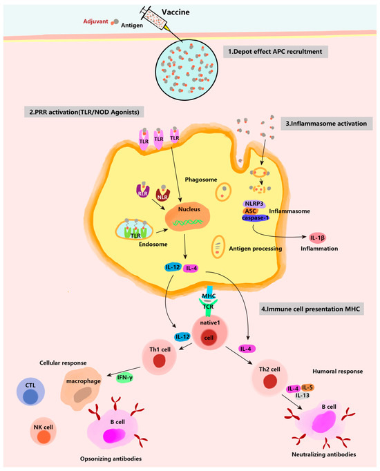 Aluminum adjuvant can enhance the antigen uptake capacity of monocytes and dendritic cells in macrophages and peripheral blood. Complexes containing aluminum adjuvants promote the activation and maturation of antigen-presenting cells [38], and studies have shown that they activate monocytes to differentiate into dendritic cells, thereby enhancing their antigen uptake capacity. Aluminum adjuvant vaccines and these mature antigen-presenting macrophages are particularly important in establishing memory responses and vaccination mechanisms that lead to long-term protection. They directly act on macrophages, promoting their maturation. The aluminum adjuvant also assists in the transfer of antigen-presenting cells within lymphoid tissue. Following subcutaneous or intramuscular injection, these cells continue to migrate to distant lymph nodes and the spleen. Additionally, dendritic cells loaded with aluminum adjuvant vaccines move to the blood through the thoracic duct and circulate to various organs. Aluminum adjuvant can also induce IL-1β and IL-18 [39], promoting the differentiation of naive CD4+ T cells into Th2 cells and enhancing antibody production.