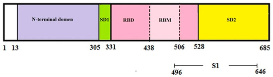 Figure 2. Recombinant protein S1 within the N-terminal S1 ectodomain of the SARS-CoV-2 spike (S) protein: RBD (receptor-binding domain; residues 319–527); RBM (receptor-binding motif; residues 438–506); SD1 and SD2 (S1 and S2 subdomains).
