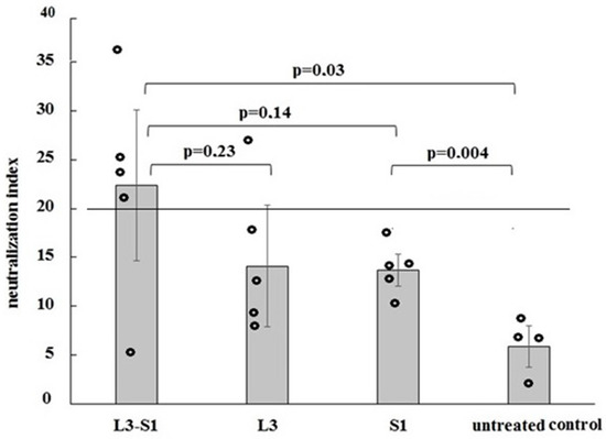Figure 3. Evaluation of virus-neutralizing activity in Syrian golden hamsters by inhibition of S protein binding to human ACE2 in ELISA. A neutralization index greater than 20% was considered positive. Statistical analysis of group means was performed using one-way ANOVA followed by pairwise comparisons with the t-test.