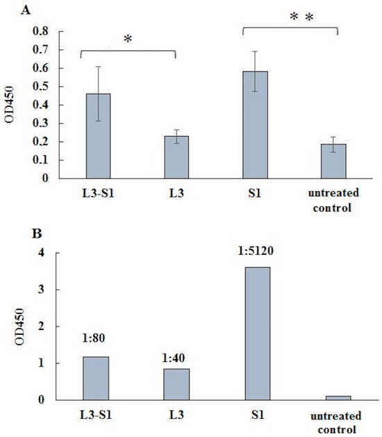 Figure 4. (A) Analysis of specific IgG levels in blood sera by indirect ELISA. The commercial full-length S protein of SARS-CoV-2 was adsorbed onto the plate. Individual sera were diluted 1:100, and OD450 was measured. Results are presented as the mean ± SEM (n = 5/group). A one-way ANOVA was used to compare the means of the groups. Statistically significant differences between groups were identified using the t-test. * p < 0.05; ** p < 0.01. (B) The original recombinant S1 protein was adsorbed onto the plate. Hamster sera from each group were pooled in equal proportions, and the antibody titer was determined for each serum pool. The figure shows OD450 values at a 1:20 dilution and serum titers.