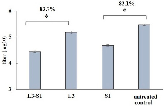 Figure 5. Analysis of infectious virus accumulation in the lungs of Syrian hamsters after infection. The figure displays the percentage of virus reproduction inhibition on days 3 (S1 and untreated control) and 6 (L3-S1 and L3) post-infection. * A statistically significant (p < 0.05) difference between groups was determined using the Mann–Whitney U test.