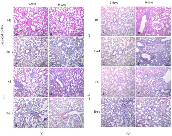 In the S1 group, a similar reduction in lung airiness was noted in all animals post-infection, along with diffuse alveolar changes and small pneumonia foci containing fibrinous-hemorrhagic exudate. However, no accumulation of neutrophilic granulocytes was detected in the pneumonia foci (Figure 6a(A)). In the experimental L3 group, reduced lung airiness persisted post-infection, accompanied by diffuse alveolar changes with fibrinous-hemorrhagic exudate and the emergence of pneumonia foci by the sixth day. Notably, no neutrophilic granulocyte accumulation was found in the pneumonia foci. Signs of productive vasculitis were evident, characterized by mononuclear and macrophage infiltration of the vascular adventitia.