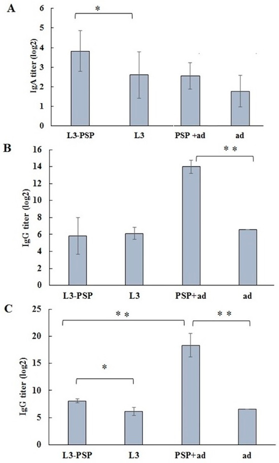 Local and systemic immune responses to vaccination were assessed by ELISA. Enzyme-linked immunosorbent assay of secretory IgA levels in nasal and oral swabs showed that, 14 days after the start of immunization, a significant increase in PSP-specific antibodies was observed in the group of animals receiving the probiotic vaccine (Figure 7A).