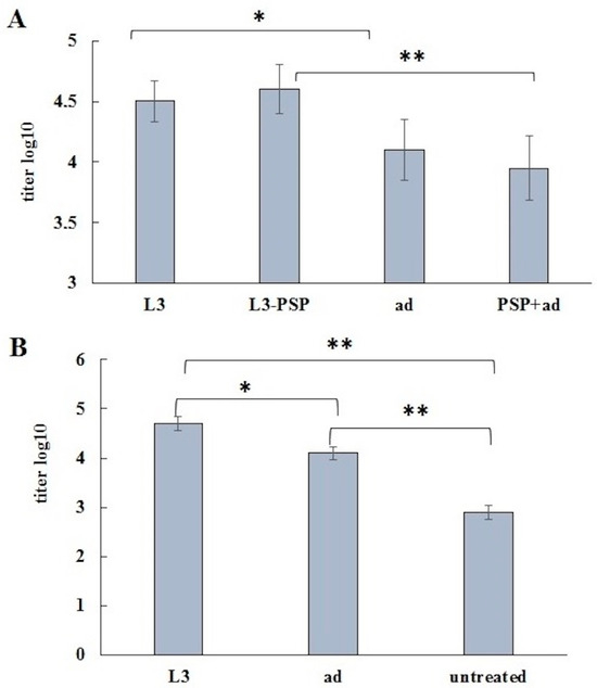 A comparative analysis of sera from the control groups (L3 and ad) and untreated animals indicated that both subcutaneous adjuvant administration and oral administration of the unmodified E. faecium L3 probiotic strain resulted in the accumulation of class A antibodies in the blood, capable of binding to the PSP antigen. Notably, this accumulation was more pronounced following oral administration of the probiotic bacteria (Figure 8B).