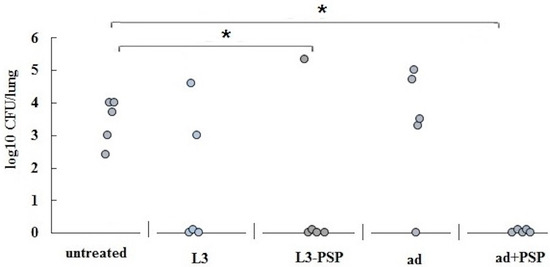 BALB/c mice were intranasally infected with a suspension of S. pneumoniae at a dose of 4 × 105 CFU. Before infection, the bacteria were incubated with sera pooled from control and vaccinated mice from experimental groups subjected to oral (L3, L3-PSP) and parenteral (ad, ad + PSP) immunization (Figure 9) and untreated intact mice.