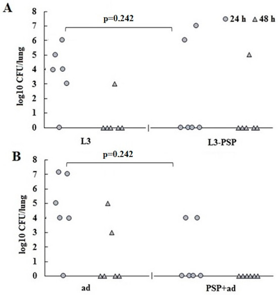 Figure 10. Determination of S. pneumoniae load in the lungs 24 and 48 h post-infection. (A) oral, (B) parenteral vaccination. Vaccinated and control mice were intranasally inoculated with 25 µL of S. pneumoniae at a dose of 105 CFU one month after the second immunization. Lung samples from five mice per group were collected at 24 and 48 h post-inoculation to assess bacterial burden. Differences between groups were evaluated using Fisher’s exact test.
