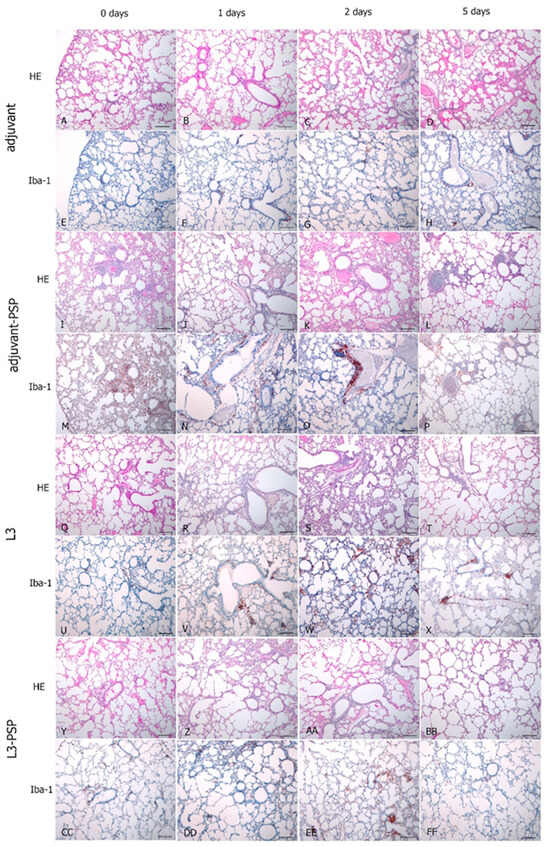 Figure 11. Histological analysis of mouse lungs following Streptococcus pneumoniae infection. Lung sections from animals in the adjuvant group are shown at day 0 (A,E), day 1 (B,F), day 2 (C,G), and day 5 (D,H) post-infection. Lung sections from the adjuvant-PSP group are displayed at day 0 (I,M), day 1 (J,N), day 2 (K,O), and day 5 (L,P) post-infection. The intensity of the Iba-1 protein accumulation in macrophages, which is essential for phagocytic function, is highlighted (EH,MP). Lung sections from animals in the L3 group are presented at day 0 (Q,U), day 1 (R,V), day 2 (S,W), and day 5 (T,X) post-infection. Lung sections from the L3-PSP group are shown at day 0 (Y,CC), day 1 (Z,DD), day 2 (AA,EE), and day 5 (BB,FF) post-infection. The Iba-1 protein accumulation in macrophages is indicated (UX,CCFF). Sections were stained with hematoxylin and eosin (HE) and subjected to immunohistochemical staining for Iba-1. Scale bar: 100 µm.