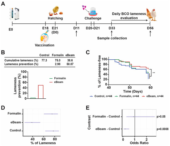 eBeam vaccine prevents lameness in broiler chickens. (A) Lameness trial experimental strategy. (B) Table shows percentages of cumulative lameness and lameness prevention of Formalin and eBeam groups compared to Control group and representative graph of lameness prevention. (C) Kaplan–Meier lameness-free curve for broiler chickens. (D) Population plot estimates of probability of lameness with 95% confidence interval (blue line). (E) Plot of the odds ratios for treatment versus control with 95% confidence interval (blue line) and OR = 1 (black line—indicates no difference). n represents the number of chickens evaluated. ** p-value < 0.01.