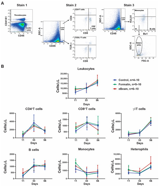 Leukocyte populations in broiler chickens were similar between the three experimental groups. (A) Representative flow cytometry gating strategy for stains 1, 2, and 3. (B) Quantification of absolute cell number of leukocytes (CD45+CD41/61− cells), CD4+T cells (CD45+CD4+CD8−TCRγδ−), CD8+T cells (CD45+CD4−CD8+TCRγδ−), γδ T cells (CD45+CD4−CD8+or−TCRγδ+), B cells (CD45+Bu1+KUL01−), monocytes (CD45+Bu1−KUL01+), and heterophils (CD45+Bu1−KUL01−SCChi) at day 11 (control n = 4; formalin n = 5; eBeam n = 6), day 33 (n = 6), and day 56 (n = 10). n represents the number of chickens evaluated; graphs show means ± SD.