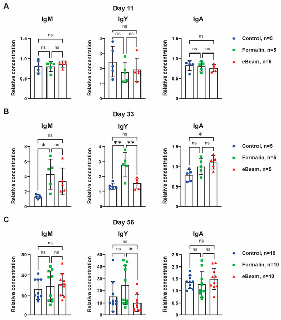 eBeam vaccine developed a more specific immune response compared to other treatments. Quantification of the relative concentration of IgM, IgY, and IgA antibodies in the serum of broiler chickens of the three treatments at days 11 (A), 33 (B), and 56 (C). n represents the number of chickens evaluated; graphs show means ± SD; ns p-value > 0.05, * p-value < 0.05, ** p-value < 0.01.