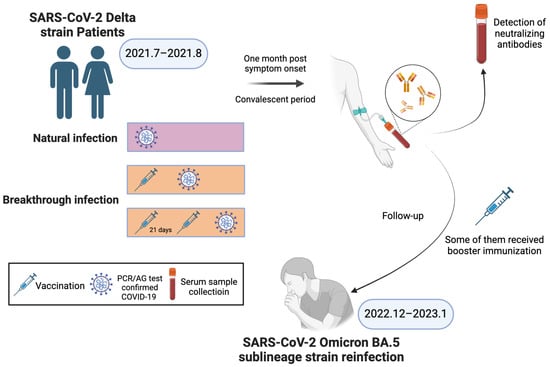 Study scheme. This study employed a cohort design, enrolling individuals who had been infected with the Delta variant. The primary outcome of interest was the incidence of the Omicron BA.5 sub-lineage reinfection observed over a follow-up period of 17 months. The main observational parameter was the neutralizing antibody levels one month into the recovery phase for individuals infected with the Delta variant.