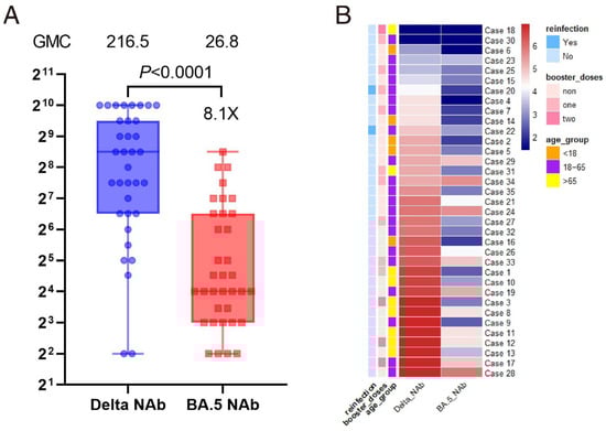 We randomly selected 35 serum samples from individuals who had recovered from Delta strain infection and used a cross-neutralization assay to investigate the neutralizing activity against Omicron BA.5. The Delta NAb and Omicron BA.5 NAb levels for each individual are shown in Figure 2A (specific neutralization levels are provided in Table S6). The GMC of the neutralizing antibodies against the Delta variant was 216.5 U/mL in 35 serum samples, while the GMC against Omicron BA.5 was 26.8 U/mL. The latter exhibited a 7.1-fold decrease in average neutralizing ability, and the difference between the two groups was statistically significant (p < 0.0001). We further illustrated the changes in neutralizing ability at the individual level using a heatmap (Figure 2B). The main part of the figure shows the NAb levels of the 35 Delta-infected sera against different strains (since Omicron BA.5 NAbs and Delta NAbs were not on the same scale, we transformed the two sets of values using logarithms to facilitate displaying inter-individual differences). In addition, we added row annotations for each case, including an outcome indicator (reinfection) and two important covariates (booster doses and age group).