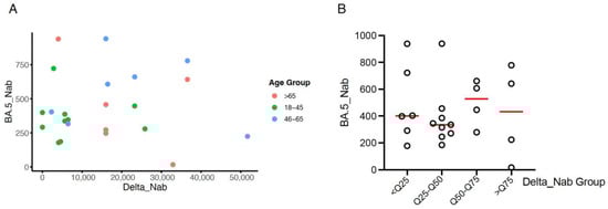 The association between initial Delta variant NAb levels and Omicron BA.5 reinfection NAb levels. (A) Scatter plot comparing Delta NAb and Omicron BA.5 NAb levels across different age groups (18 < 45, 46–65, and >65 years). No significant correlation was observed between Delta NAb and Omicron BA.5 NAb levels in any age group. (B) Comparison of Omicron BA.5 NAb levels across quartile groups based on Delta NAb levels (<Q25, Q25–Q50, Q50–Q75, and >Q75). The horizontal lines represent the median NAb levels for each group.