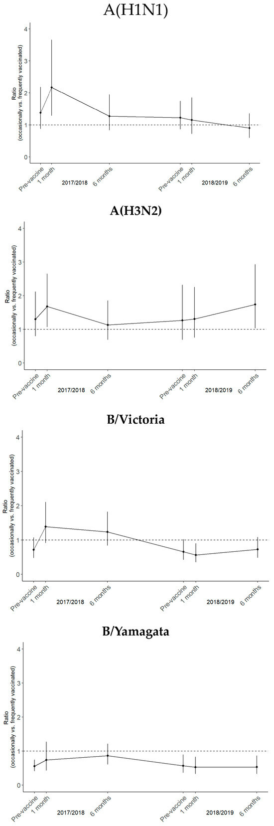 GMT ratios (occasionally vs. frequently vaccinated HCWs) with confidence intervals (CI 95%) (vertical bars) for influenza A(H1N1), A(H3N2), B Victoria, and B Yamagata. GMT ratios were adjusted for age and gender, and the 2017/2018 pre-vaccination GMT was considered for reference. For the 49 participants that repeatedly received the seasonal TIV during 2017/2018 and 2018/2019 seasons, 6 time points were considered during the follow-up period (pre-vaccine 2027/2028, 1 and 6 months post-vaccination, pre-vaccine 2018/2019, and 1 and 6 months post-vaccination).