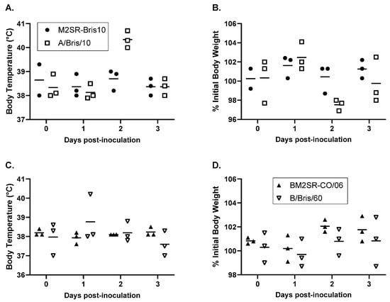 Elevated body temperatures of 40.3–40.7 °C were observed in ferrets inoculated with WT A/Bris/10/2007 on day 2 and in one of the ferrets inoculated with WT B/Bris/60/2008 on day 1 post-inoculation (Figure 1A,C). Body temperatures returned to normal range by day 3 post-inoculation. Body temperatures for M2SR- and BM2SR-inoculated ferrets remained in the normal range throughout the duration of the study.