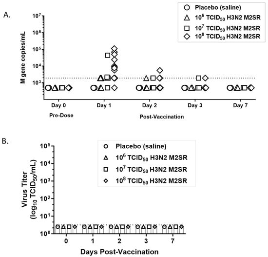 Nasal swabs were collected from subjects 18–49 years old into viral transport media (VTM) on days 0 (pre-dose), 1, 2, 3, and 7 and frozen at ≤−65 °C in a phase 1, blinded, placebo-controlled, randomized, dose-escalation study, with M2SR described previously (Clinical Trials Registration: NCT02822105) []. Briefly, healthy adults were randomized 3:1 for M2SR or placebo into four cohorts: 106 TCID; 107 TCID50; and 108 TCID50 M2SR or placebo. M2SR-Bris10 and placebo (sterile physiological saline) were intranasally administered using the VaxINator™ Intranasal Mucosal Atomization Device (Teleflex, Morrisville, NC, USA). Vaccine virus shedding was evaluated by real-time quantitative reverse-transcription polymerase chain reaction (qRT-PCR) and a TCID50 infectivity assay in M2CK cells []. Briefly, thawed nasal swabs were split into two aliquots: one aliquot evaluated in TCID50 assay [] and one aliquot used for RNA extraction by magnetic silica beads for TaqMan qRT:PCR designed to detect influenza A Matrix gene, as described previously [].