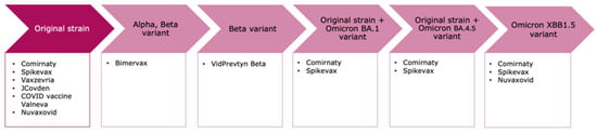 In the EU in 2022, only the mRNA vaccines were adapted (to Omicron BA.1, then Omicron BA.4-5). In 2023, adaptations were made to two mRNA vaccines and one recombinant protein vaccine (all to Omicron XBB.1.5). The current regulatory strategy for these products, which have now accumulated variant update experience, requires CMC and non-clinical data, as well as demonstrating that updated vaccines induce an immune response that can predict clinical efficacy and safety in humans []. These updates intend to broaden immunity against circulating variants and thus support vaccination strategies, as evidenced by clinical studies with the adapted vaccines [,,,,]. The European Medicines Agency (EMA) collaborates with international medicines regulators and the World Health Organization (WHO) to align strain recommendations as far as possible [].
