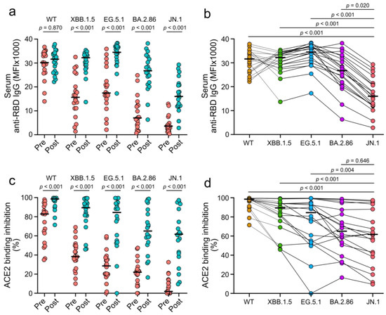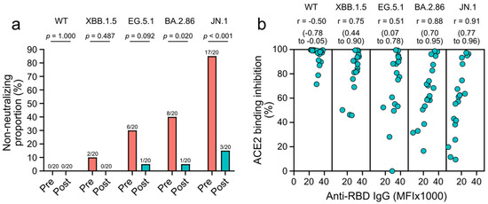 - Systemic levels of variant-specific anti-receptor binding domain (RBD) IgG and serum-mediated inhibition of ACE2 binding by wild-type SARS-CoV-2 and the XBB.1.5, EG.5.1, BA.2.86, and JN.1 lineages before and after receiving an XBB.1.5 mRNA vaccine as a fourth vaccine dose;