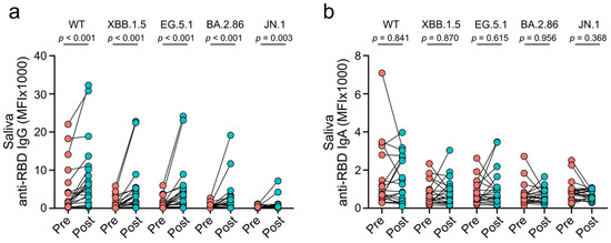 - Saliva levels of anti-RBD IgA and IgG against wild-type SARS-CoV-2 and the XBB.1.5, EG.5.1, BA.2.86, and JN.1 variants before and two to four weeks after vaccination;