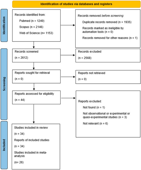 Using the search terms, 4548 records were found across the databases. After the removal of 1935 duplicates and 1 article that had been withdrawn from publication, 2612 items were screened by title and abstract. Of the 44 records remaining, 10 were eliminated because they did not match the qualifying requirements. The final systematic review comprised 34 publications, with 26 papers included in the meta-analysis. Figure 1 outlines the selection procedure.