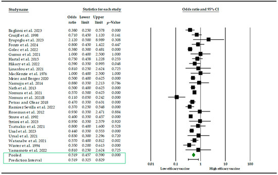 The meta-analysis was based on a synthesis of the findings from 25 studies. Eight studies were excluded from the analysis due to the unavailability of the requisite data. The effect size index is represented by the odds ratio as vaccine efficacy (VE). As illustrated in Figure 2, the meta-analysis results indicate that smokers are at an elevated risk of producing a diminished level of immune cells (VE, 0.519; 95% CI, 0.457–0.590, Figure 2).