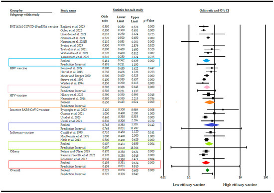 Five of the included studies were clinical trials—four [14,16,17,23] were randomized and one [15] was not randomized. According to the CLEAR NPT checklist for bias risk testing, three clinical trials have a medium bias risk and two a low bias risk. Twenty-one of the selected articles [19,20,21,22,24,26,27,28,29,31,32,33,34,37,38,39,42,43,44,45,47] reported cohort studies and the remaining eight reported cross-sectional studies [18,25,30,35,36,40,41,46]. According to the NOS scale for the quality of cohort and cross-sectional studies, twenty-four of them were good quality, four were shown to be of fair quality and only one was shown to be of poor quality. The studies took place in different continents (Europe, Australia, Asia, USA) and were carried out over the period from 1976 to 2024. Vaccinations against COVID-19, influenza, pneumococcus, HBV, HPV, tetanus, pertussis, polio, haemophilus influenzae type b, measles–mumps–rubella, and recurrent urinary tract infections were analysed.