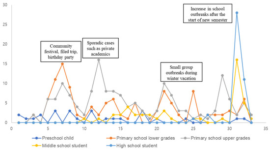 Of the 419 patients, 235 (56.1%) were male and 184 (43.9%) were female. In total, 340 cases (81.1%) were reported from urban areas, while 79 cases (18.9%) were from rural areas. By age group, there were 133 (31.8%) patients aged 7–9 years and 151 (36.0%) aged 10–12 years. The elementary school age group accounted for the highest proportion of patients (67.8%). Initially, the incidence was higher among preschool and elementary school students. However, from December 2023, the number of cases increased among middle and high school students who previously had no cases (Table 1). This trend became particularly pronounced in April 2024, when there was a substantial surge in cases across all age groups (Figure 1).