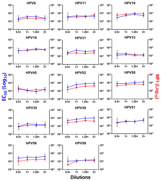 - Zhang, X.; Meng, D.; Li, H.; Li, X.; Li, J.; Hu, P.; Zhao, L.; Wang, R.; Zhao, C.; Luo, C.; et al. Validation of Luminex immunological and competitive Luminex immunological assays for clinical immunogenicity assessment of a 14-valent recombinant human papillomavirus vaccine. J. Med. Virol. 2023, 95, e29050. [Google Scholar] [CrossRef]