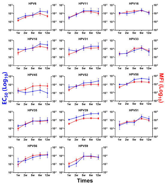 3.2. The 14-Valent HPV Vaccine Candidate Can Induce Strong and Long-Lasting Humoral Immune Response